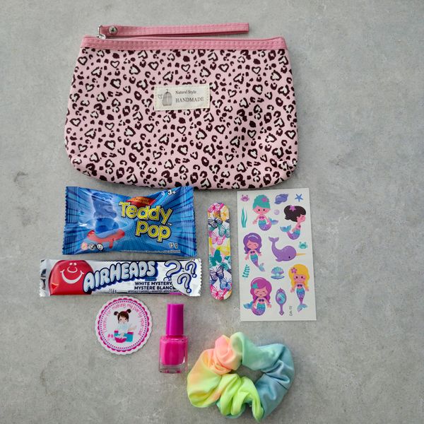 Each cute zip up bag contains a nail polish, a tie dye scrunchie, a sheet of temporary tattoos, a nail file, candy, a Teddy Bear Ring Pop and a cute sticker that says Thanks for making my party spa-cial.